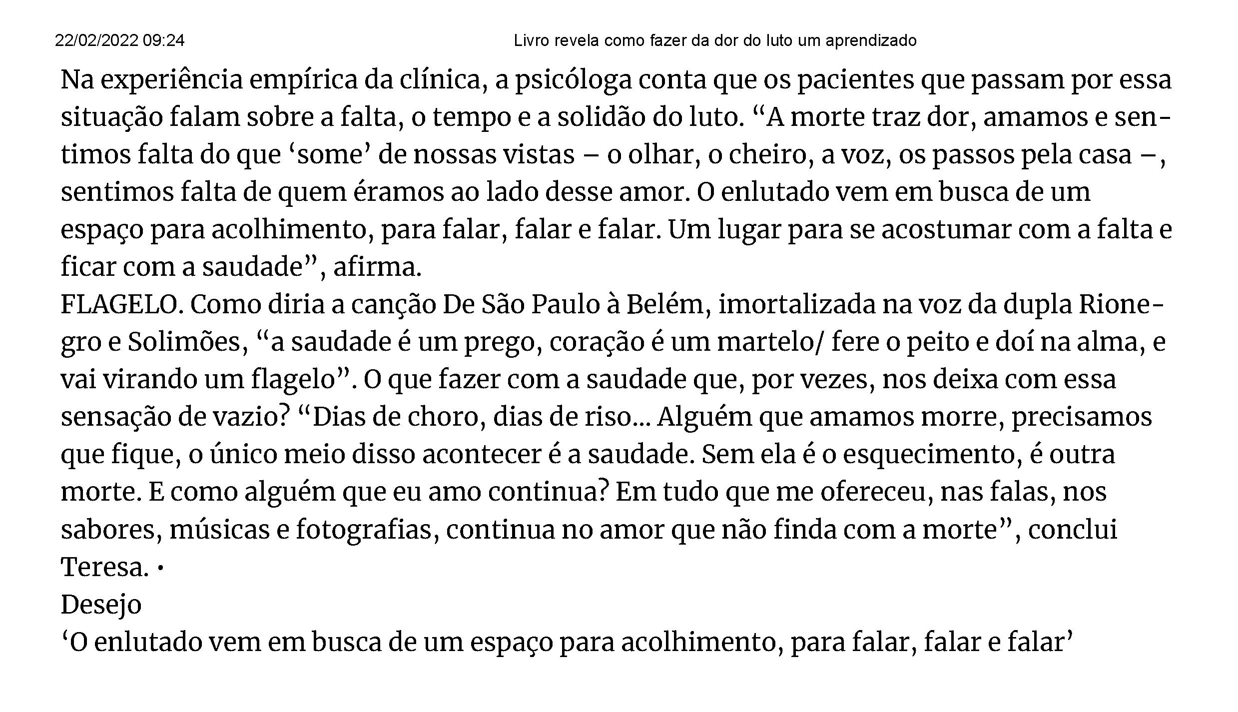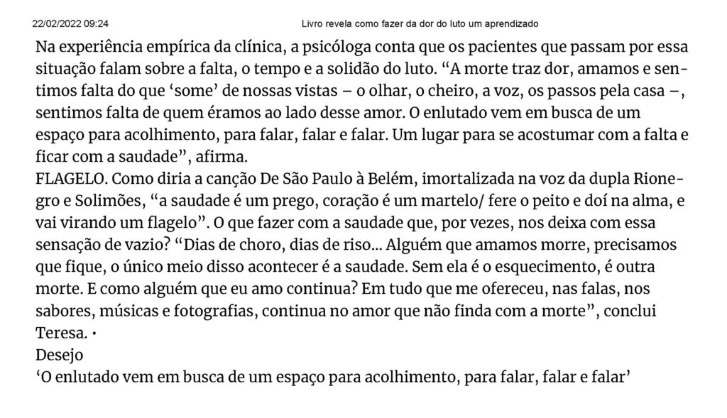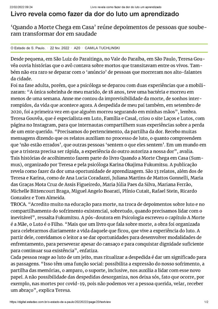 Para ler matéria na íntegra (assinantes do jornal), acesse: https://cultura.estadao.com.br/noticias/geral,livro-revela-como-fazer-da-dor-do-luto-uma-oportunidade-de-aprendizagem,70003986086
