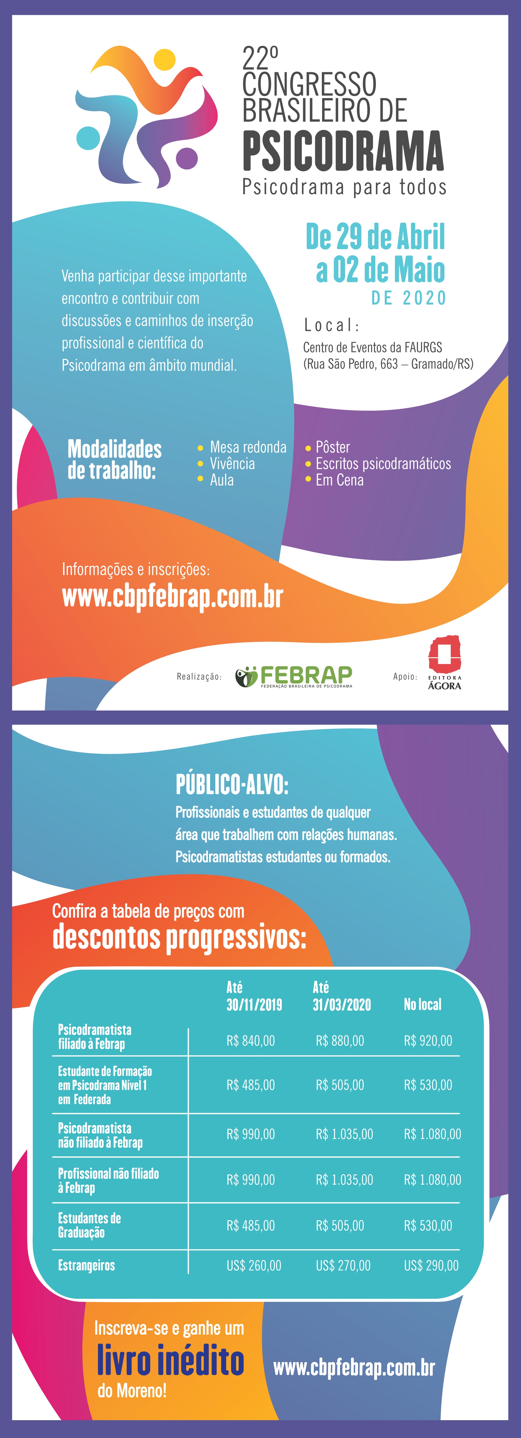 A Editora Ágora é mais uma vez a patrocinadora oficial do Congresso Brasileiro de Psicodrama. Maior editora de livros de psicodrama da América Latina, a Ágora comercializará os seus títulos e de outras editoras, com exclusividade, nesta que será a 22ª edição do evento. O Congresso acontece de 29 de abril a 2 de maio de 2020, em Gramado – RS. Abaixo e no site www.cbpfebrap.com.br, você encontra todas as informações para inscrições. Participe!